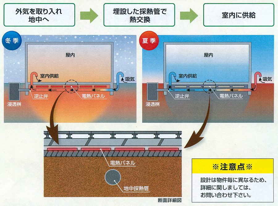 地中熱を利用した熱交換方式で、冬は外気を暖め、